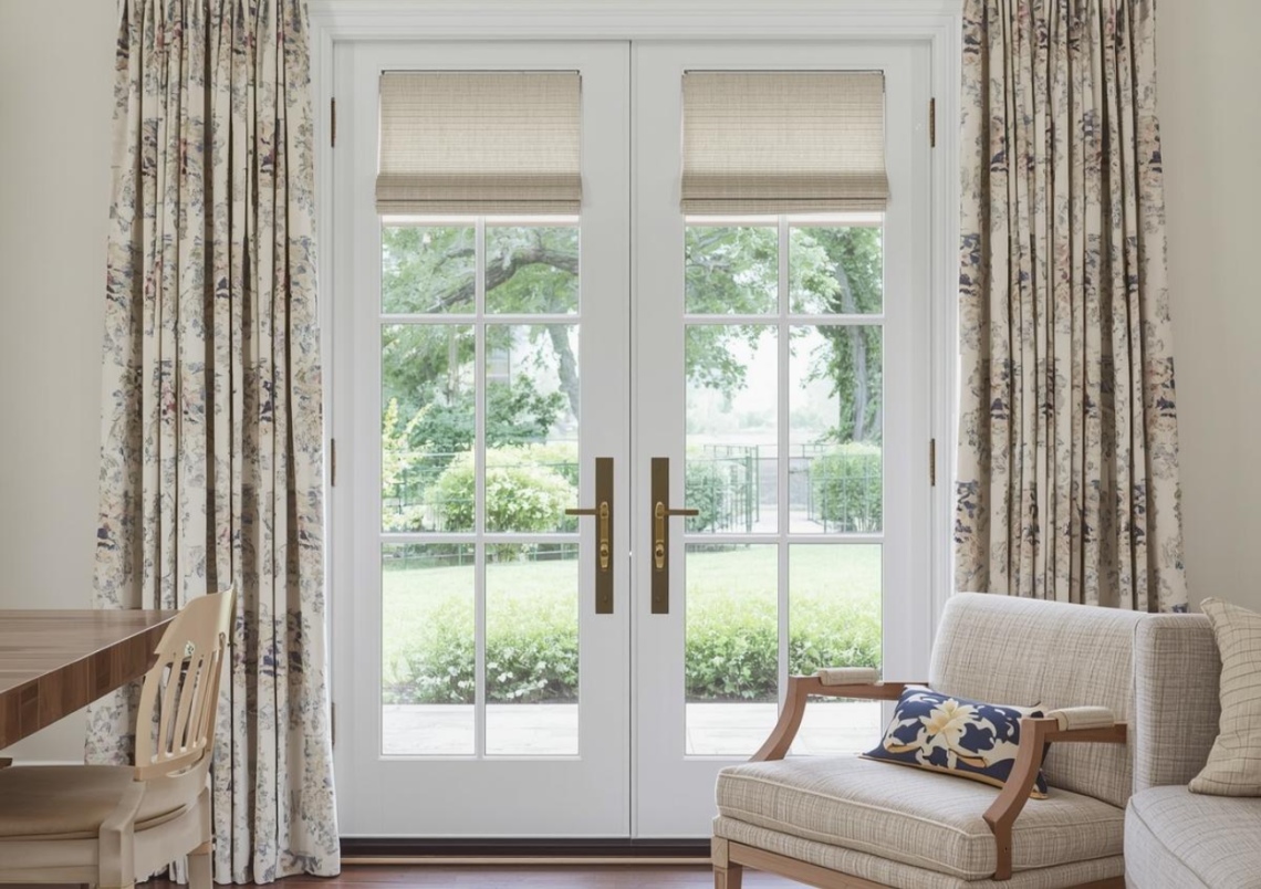 French doors look stunning with cellular shades that mount directly inside the door glass panels, classic plantation shutters