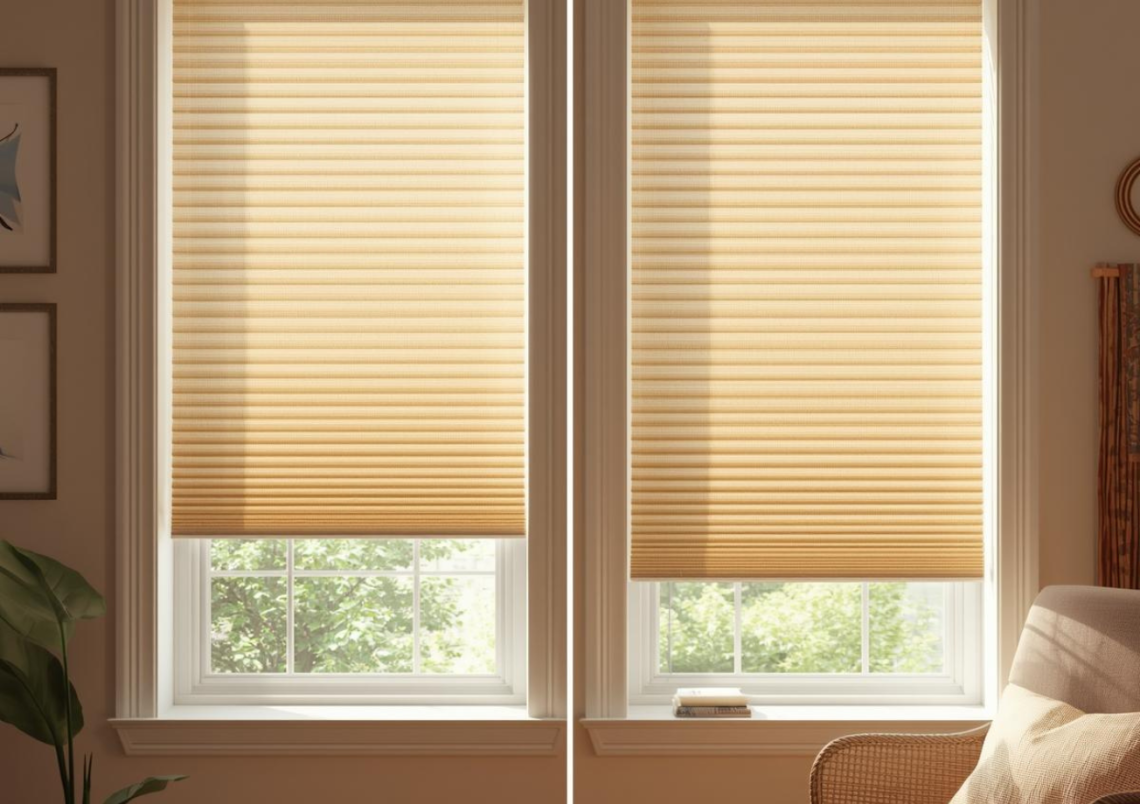 Cellular shades with high insulation values, solar shades with UV protection, and exterior solar screens are the best